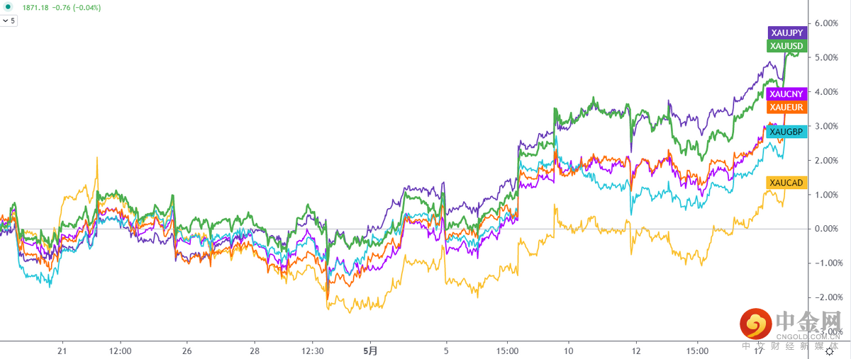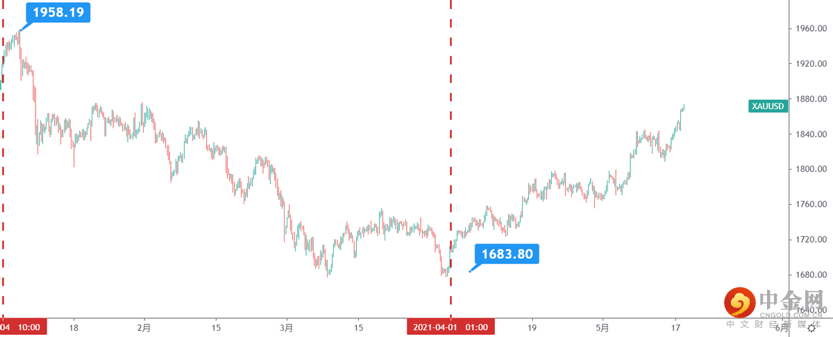 五月起,曾经光芒万丈的黄金再度回归到人们眼中。5月至今,黄金大幅攀升100余美金,涨幅达到6.23%。昨日(5月17日)黄金现货价格更是突飞猛进,接连突破1850和1870两大关口。相比于2021年第一季度下跌270美金(跌幅13.84%),迈入第二季度的黄金似乎迎来了盛夏行情。