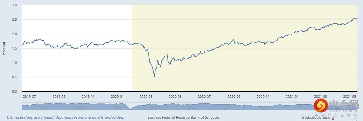 盈亏平衡通货膨胀率(10-Year Breakeven Inflation Rate)是10年期国债收益率和10年期TIPS债券收益率相减得出的预期通胀指标。盈亏平衡通货膨胀率可以衡量未来10年通胀将平均达到什么水平。目前这一指标已经攀升至2.54%,暗示未来十年通胀平均将达到2.54%。