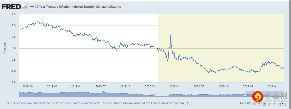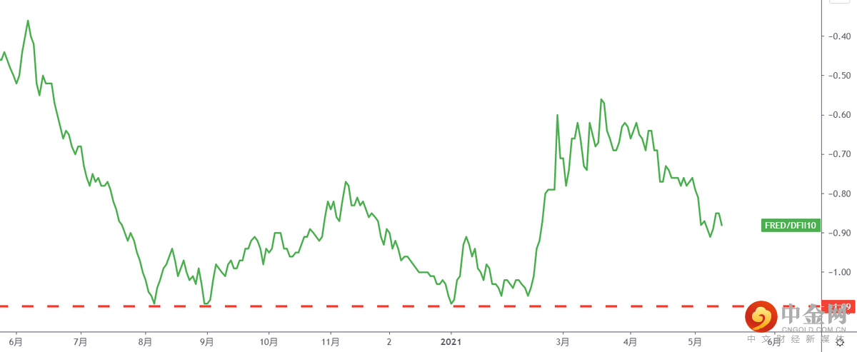 下图就是TIPS收益率曲线,近期随着市场通胀预期的上升,这一收益率又开始下滑,最新的数值为-0.88%。