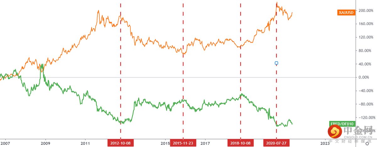 这一指标与黄金呈现明显的反向相关关系,2018年10月至2020年8月,这一指标持续下滑;对应的黄金开启了新的一轮牛市。下图中橙色线段是金价,绿色线段是TIPS收益率。