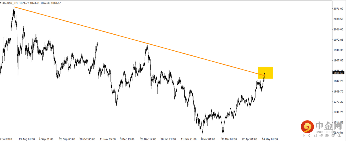 走势图中,现货黄金价格已经突破了去年8月以来的下降趋势线。未来伴随通胀预期施压TIPS收益率下行的状况,黄金进一步上行的空间和概率较大。