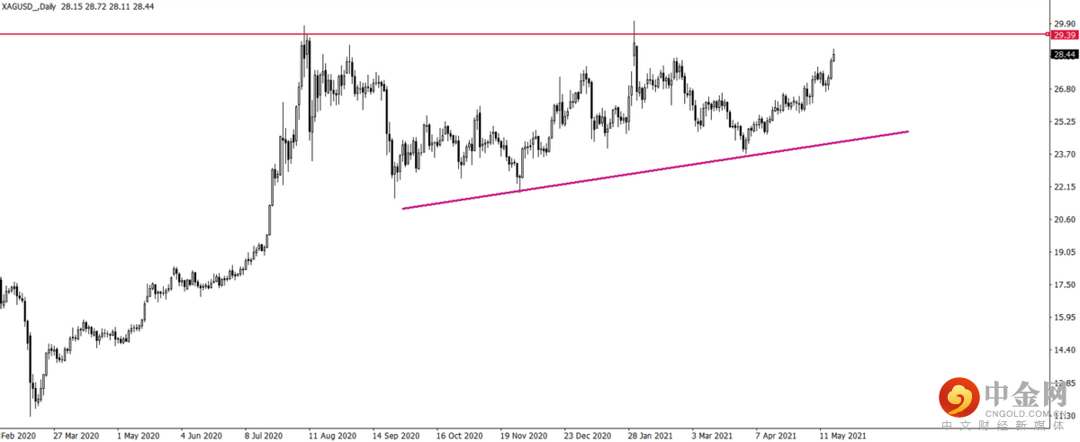 与黄金相关性较高的白银,未来突破29美金附近的阻力位置概率正在升高。若能突破,则可以形成中继三角形。