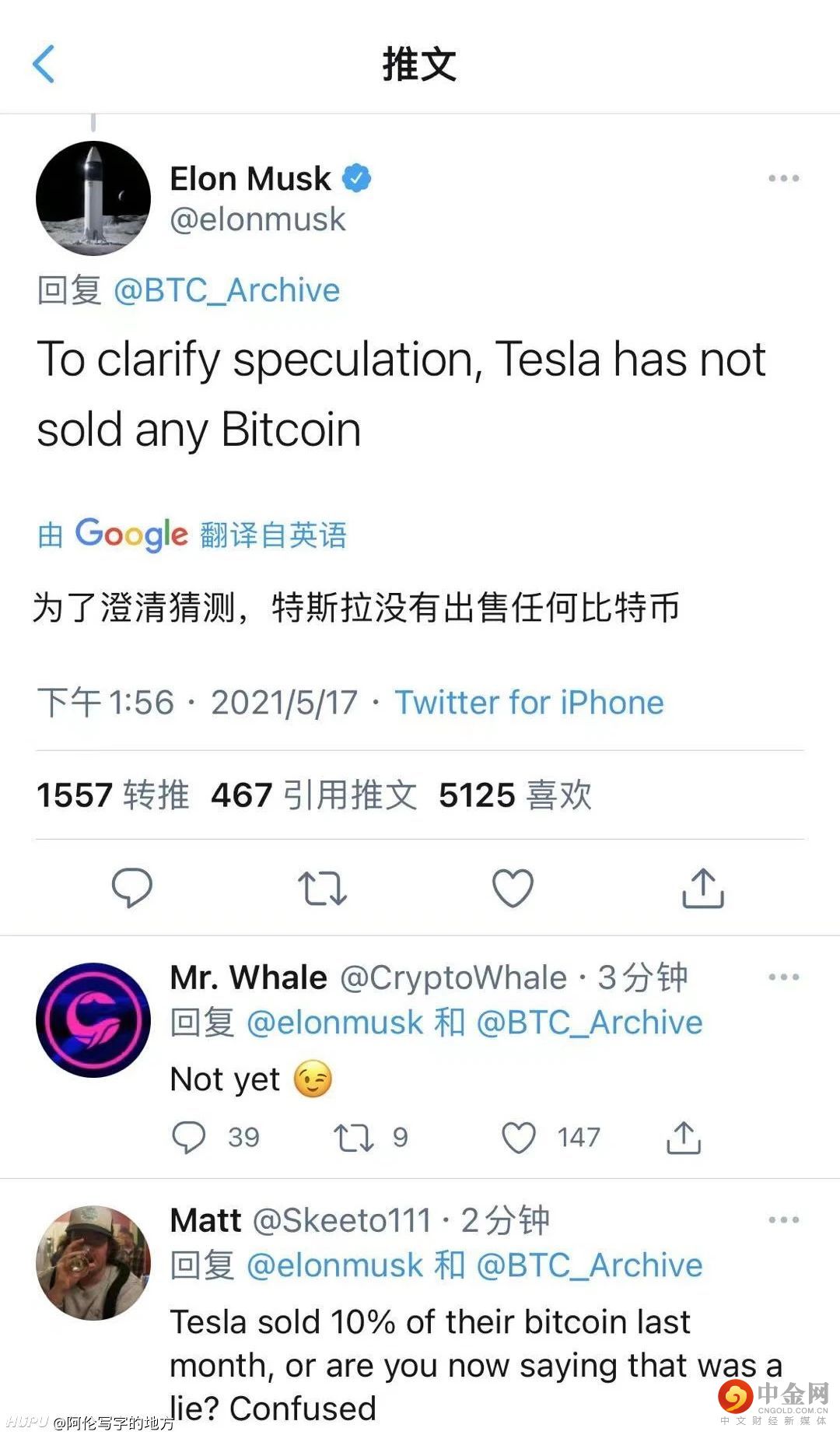 但很快马斯克澄清了自己的言论,在昨天晚些时候的推特中马斯克澄清特斯拉并没有出售已经持有的比特币。据Bitstamp行情,此条推文一出,比特币交易价格短线回升2000美元。