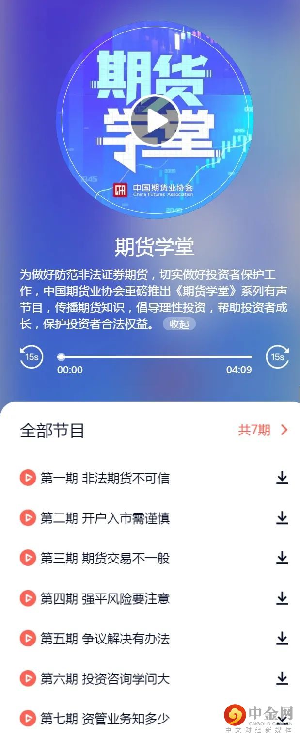 为做好防范非法证券期货,切实做好投资者保护工作,中国期货业协会重磅推出《期货学堂》系列有声节目,传播期货知识,倡导理性投资,帮助投资者成长,保护投资者合法权益。