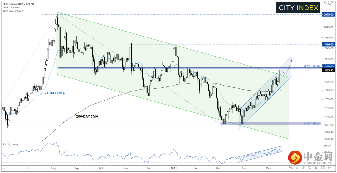 话虽如此,随着20天指数移动均线构成支撑、200天指数移动均线数月中首度调头向上,金价的中线动能显然已转到多头阵营。如果确认突破1875,或打开延续上涨的空间,后市上攻前阻力位1960或心理阻力大关2000。只有下破上涨通道下轨与200天指数移动均线所在的1800区域,短线上涨趋势才可能落空。