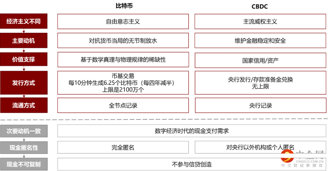比特币诞生于2008年全球金融危机之后,向无节制的货币宽松提出抗议;而央行数字货币(后简称CBDC)明显提速则出现在2020年,更多是出于各国央行适应数字变革、维护金融稳定的需求。CBDC与比特币所代表的经济主张之异赋予了两者截然不同的价值保证,前者仍以国家信用为主要支撑,而后者则追求去中心化,以当下人类认知范围内的数学真理自证价值。然而,面对数字经济大趋势,比特币与CBDC却又不谋而合地代表了同一种诉求,即提供区别于电子存款的电子现金形式,以满足数字时代的现金支付需求。从比特币与CBDC的同与不同研判,不难看出,CBDC的定位即是人人皆可使用的货币,而比特币则因稀缺性展现出更强的资产属性。我们认为,比特币难以成为经济活动的主流货币,并非由于相对美元的高波动性与不甚理想的交易速度,而是其背后的经济哲理主义所决定。追求小众认同,意味着为实现稀缺与自治的理念,比特币的操作流程并不新手友好;而对抗通货膨胀,则带来了比特币通缩螺旋的难题,脱离债务的比特币可能迫使经济停滞不前。相比之下,CBDC兼具信用货币的易操作性与数字货币的去中介化,更宜作为数字时代的金融基础设施,其所代表的电子现金虽同样不参与货币创造,但能与商业银行体系中的电子存款互相补充,无需过度放大通缩担忧。从这一角度,现阶段以比特币替代黄金配置需求的估值逻辑有其合理性,而指望以比特币交易代替整个美元支付系统结算则显然并不可靠。抛开技术理解比特币与CBDC的异同,两者的时代背景与研发动机是较为合适的切入点。2009年1月3日,第一枚比特币问世,创始人中本聪在区块里写下“当时正是英国财政大臣第二次出手纾解银行危机之时。”,点明了本人创造比特币的最大动机。2008年次贷危机席卷全球,美联储为救市推出了一系列的量化宽松政策,比特币在此刻推出,首要目标就是为了对抗货币当局的无节制放水以及潜在的恶性通货膨胀。反观CBDC的进程则要滞后许多,虽然早在2014年,厄瓜多尔央行就提出了最早的CBDC,但当时并未得到重视,直到2019年,全球主流央行仍然对CBDC持谨慎保守的态度。CBDC真正进入大众视野并且出现明显提速是在2020年。一方面,彼时Facebook发布了Libra白皮书,“超主权”以及“超银行”属性当头,剑指商业化的全球私人货币体系,引发各国央行警惕;另一方面,新冠疫情推动了数字经济的加速进化与重心下沉,“无接触”支付成为刚需,是率先推出法定电子货币还是放手让私人支付机构接管,成为各国央行的最大考量。因此,尽管不同国家央行研发CBDC的政策目标会有些微差异,但共同且首要的目标是维护金融稳定,在加速变革的数字经济时代巩固法币地位,将数据主权由锋芒渐露的金融科技企业过渡回央行监管的传统框架体系之下。除了上述主要动机之外,比特币与CBDC在次要动机上展现出一致性,旨在提供一种区别于电子存款的电子现金形式,以满足数字时代的现金支付需求。图1:比特币与CBDC的同与不同