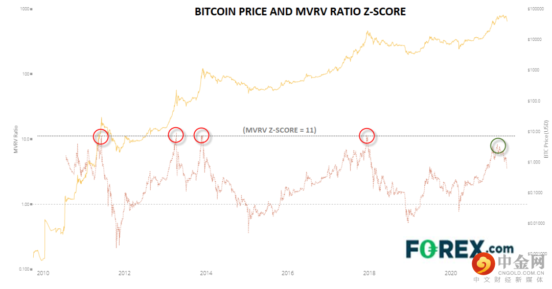 正如我们上月在回顾比特币价格历史时所指出,比特币在当前牛市周期的上涨幅度依然低于历史平均水平。所以,尽管今天暴跌,牛市还是有可能延续。另一需要关注的比率是比特币的MVRV Z-Score,其衡量比特币市值(市场价值)相对每个比特币前交易价格(现实价格)。在以往的牛市周期顶峰,此比率总是达到11,而这轮周期(到目前为止)只上升至8左右: