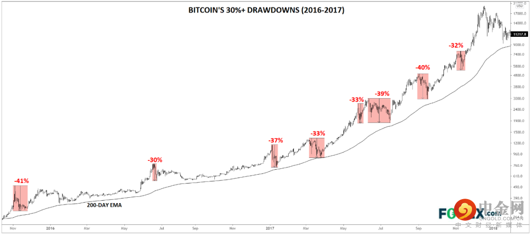 每当市场震荡时,退后一步回顾历史数据可以看得更清楚。比特币目前的暴跌当然会惊吓当下的多头,但有经验的长期持有者知道,比特币在牛市中暴跌是常态。如下图所示,在2015-2017年牛市最终触顶之前,比特币出现过7次、每次幅度为30%的独立回撤行情。