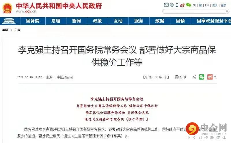 国务院总理李克强5月19日主持召开国务院常务会议。会议指出,今年以来,主要受国际传导等多重因素影响,部分大宗商品价格持续上涨,一些品种价格连创新高。要高度重视大宗商品价格攀升带来的不利影响,贯彻党中央、国务院部署,按照精准调控要求,针对市场变化,突出重点综合施策,保障大宗商品供给,遏制其价格不合理上涨,努力防止向居民消费价格传导。