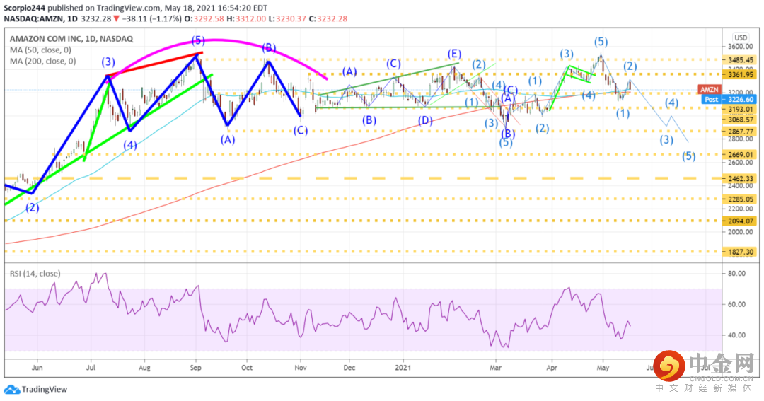 我曾表示亚马逊已经完成下跌的第一浪,我们将观察到第二浪的完成。如果真的是这种走势,下一个更低的边将为可观的跌幅,推动亚马逊股价跌向2870美元。