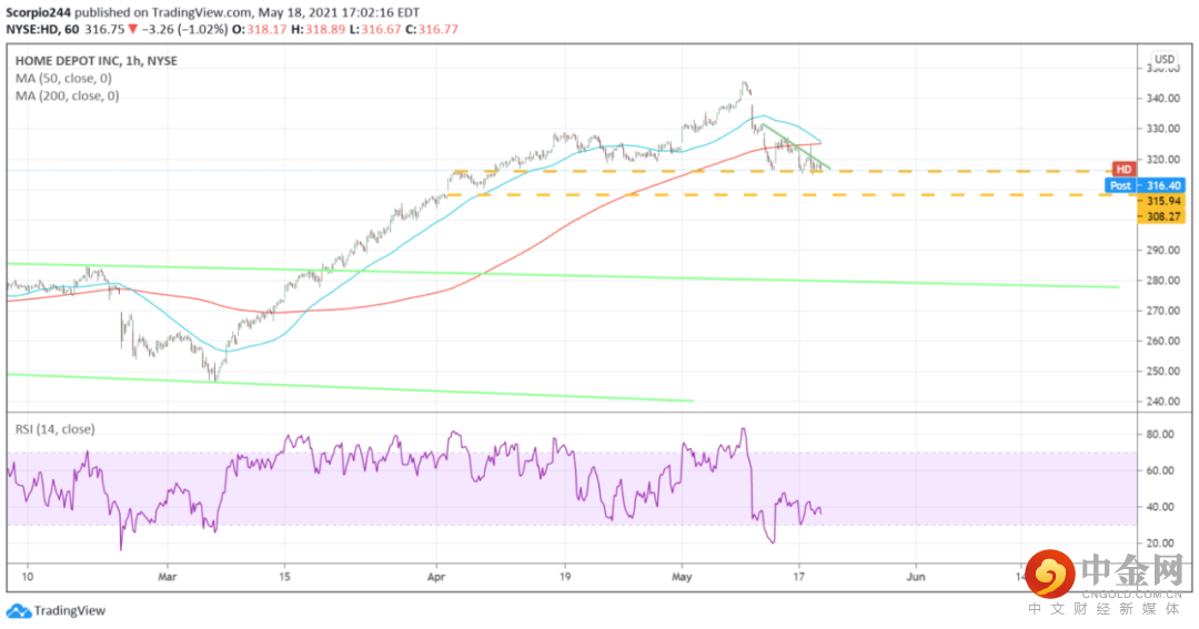 家得宝的图表看起来不佳,正位于316美元的关键支撑线上。