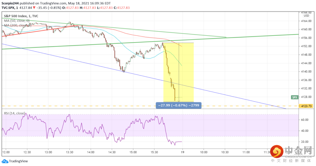 您可以在图表中发现端倪,标普500指数在14:30左右跌破了该趋势线,随后反弹并试探该趋势线。标普500指数试探失败后,导致了抛售盘出现,这是为何我认为明天将面临更大抛售压力的原因。