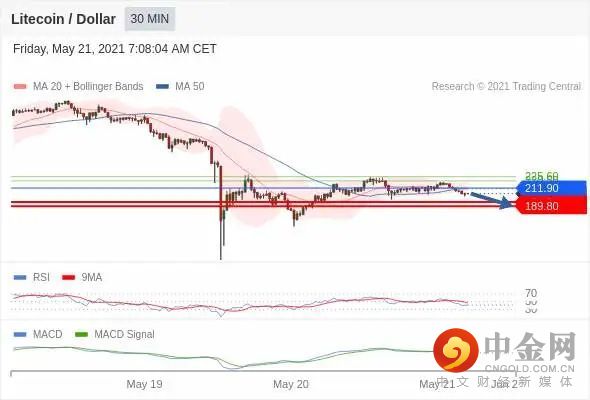 向上突破 211.90 ,将带来继续上行的趋势,目标位定在 220.50 和 225.60 。