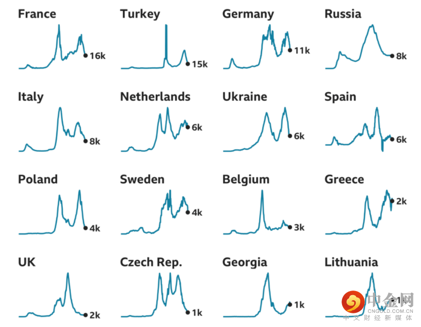 (欧洲各国7天平均确诊病例,2020.1-2021.5)