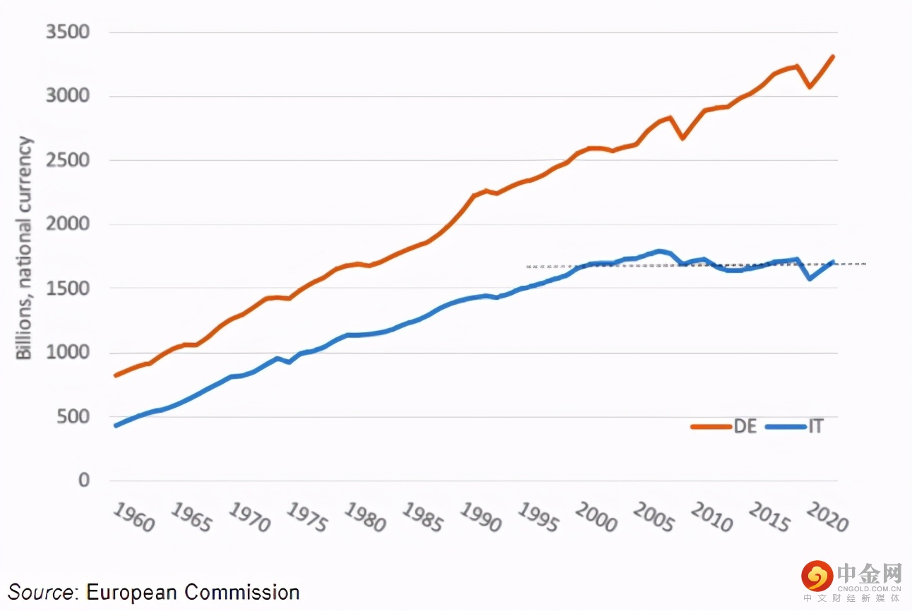 (德国橘线与意大利蓝线真实GDP对比,1960-2020)