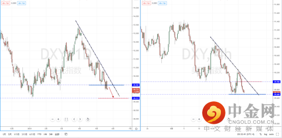 美元指数天图:短期价格在关键位置附近继续下行,整体格局依然保持空头方向。上方有下降趋势线的压制作用,其水平压制带在89.987一带。从日内4小时级别,价格受阻后继续下行,但下方有短期支撑作用。可适当关注趋势调整后继续破位的空头机会,下方目标位置参考89.217附近。