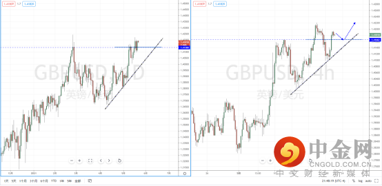 镑美天图:短期价格在纠结中站上前期水平压制带1.41380附近,整体趋势继续处于在多头阶段。下方有上升趋势线的支撑作用,从日内4小时级别,价格虽有突破但不宜追多行情。可适当关注价格调整后的多头机会,上方目标位置参考1.42459附近。