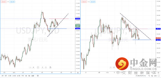 美日天图:目前行情在上方压制区域109.759附近继续受阻承压,并且短期价格正处于测试上升趋势线附近。从日内4小时级别,价格在受阻后下探至前期支撑带108.757附近。可适当关注价格在此区间的表现,如果破位将可能继续下探,并转势为空。