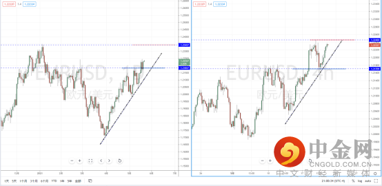 欧美天图:目前整体行情继续保持多头方向,下方有上升趋势线的支撑作用,短期水平支撑带在1.21837附近。从日内4小时级别,价格在有效测试后冲击上方压制带1.22459附近。可适当关注价格调整后上行突破机会,上方目标位置参考1.23437附近。