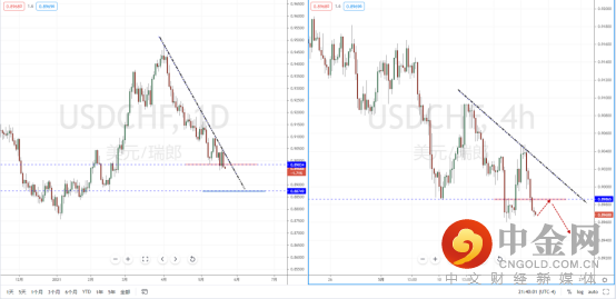 美瑞天图:目前行情在上方下降趋势线的压制作用下继续受阻下行,并且短期价格有小幅跌破水平支撑带0.89834一带。从日内4小时级别,价格在破位后也即将临近支撑区域。近期关注价格调整后继续走弱的空头机会,下方目标位置参考0.88749附近。