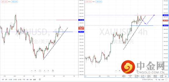 黄金天图:目前行情在冲高后有回落迹象,但整体趋势继续保持多头格局。下方有上升趋势线的支撑作用,短期水平支撑带在1845.633附近。从日内4小时级别,价格在受阻回落并且形成近期窄幅区间整理。可适当关注价格调整后回测支撑后继续起稳上行的多头机会,上方目标位置参考1919.006附近。