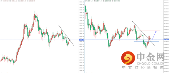 恒生指数天图:短期价格在下方支撑带27958.40附近起稳,并且价格也正在冲击上方下降趋势线的压制作用。从日内4小时级别,价格处于在小幅调整阶段,可关注其趋势回测支撑后再次起稳的多头机会,上方目标位置参考28780.95附近。