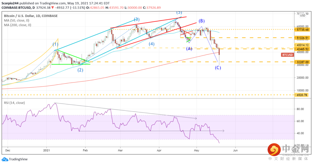 相对强弱指数RSI上出现技术“超卖”:我们应该会看到比特币反弹,可能会重返42000美元。对底部再测试会导致比特币再度跌至30000美元区间。