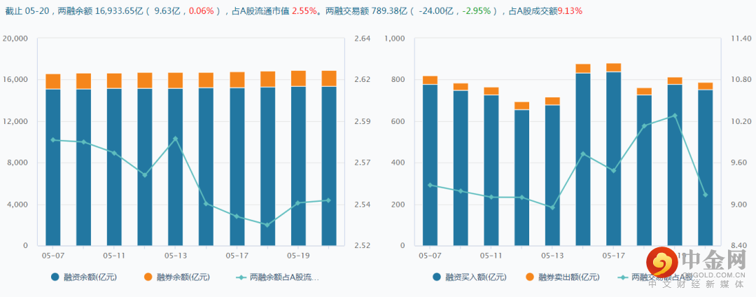 融资融券余额方面,截止5月20日,两融余额16933.65亿,占A股流通市值2.55%,两融交易额789.38亿,占A股成交额9.13%。最近两融余额缓慢上行,市场情绪小幅回暖。(见图5)