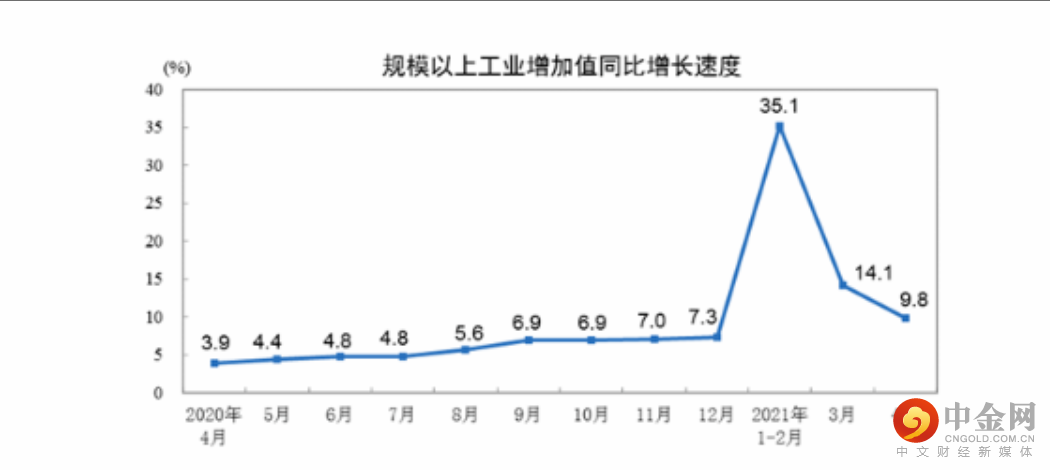 国家统计局17日公布数据显示,中国4月工业增加值同比增长9.8%,预期增长10%,前值增长14.1%。1—4月份,规模以上工业增加值同比增长20.3%。(见图7)