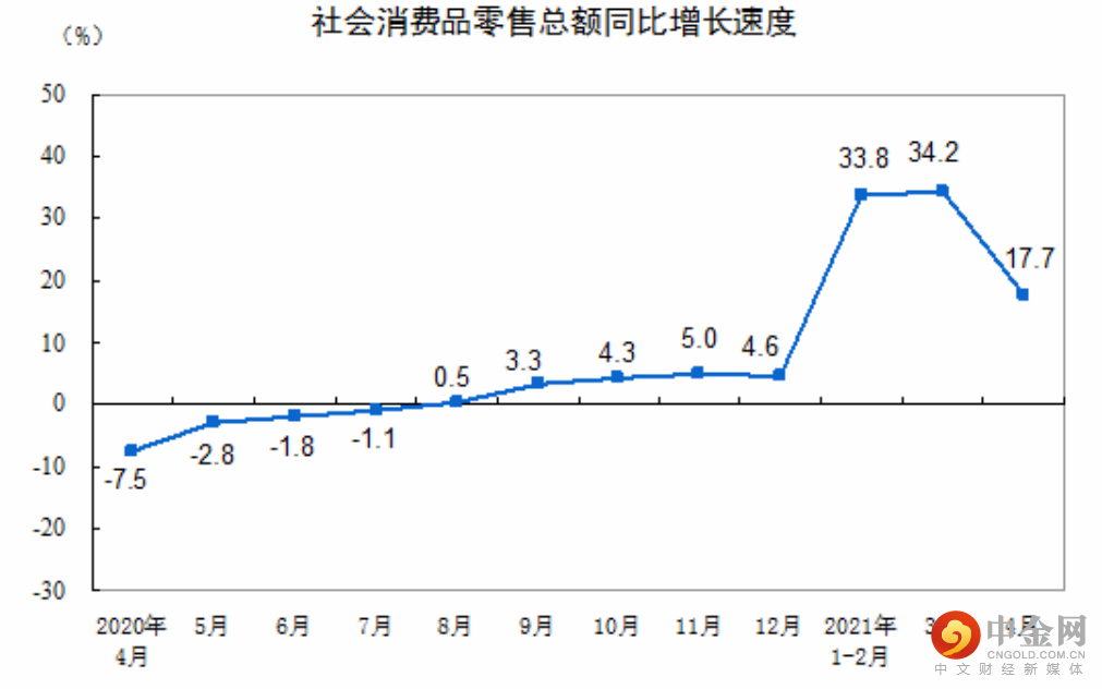 国家统计局17日发布数据显示,中国4月社会消费品零售总额同比增长17.7%,预期增长25%,前值增长34.2%。1—4月份,社会消费品零售总额138373亿元,同比增长29.6%。(见图9)