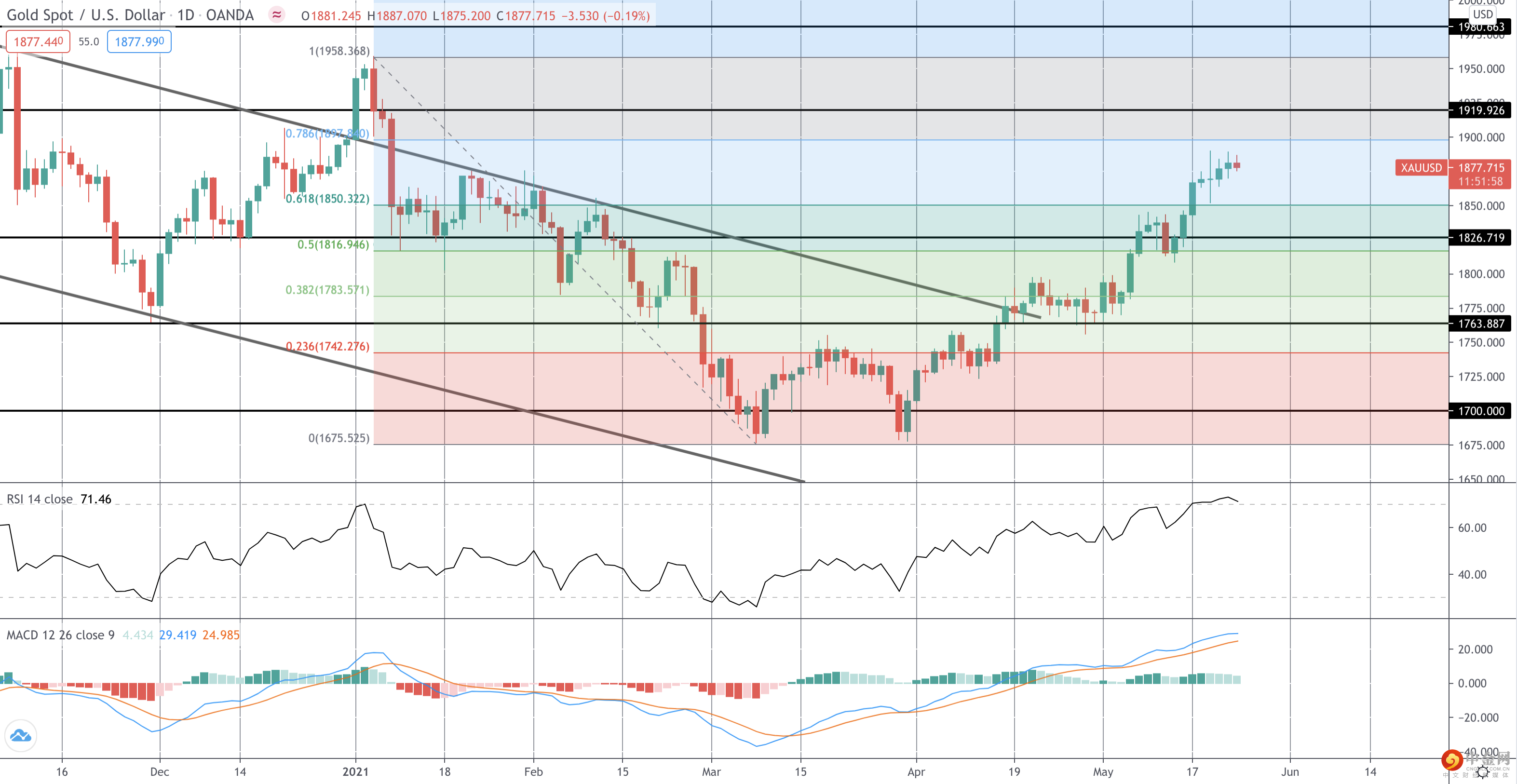 黄金价格从去年的高点突破熊市通道后,市场就从高点回撤至50%的回撤位上方。 在RSI和MACD的支撑下,关注的焦点是进一步上扬,然后测试下一个61.8%的回撤位,在1900水平附近,而1919.92的水平位于该水平之上,是下一个值得关注的阻力位。