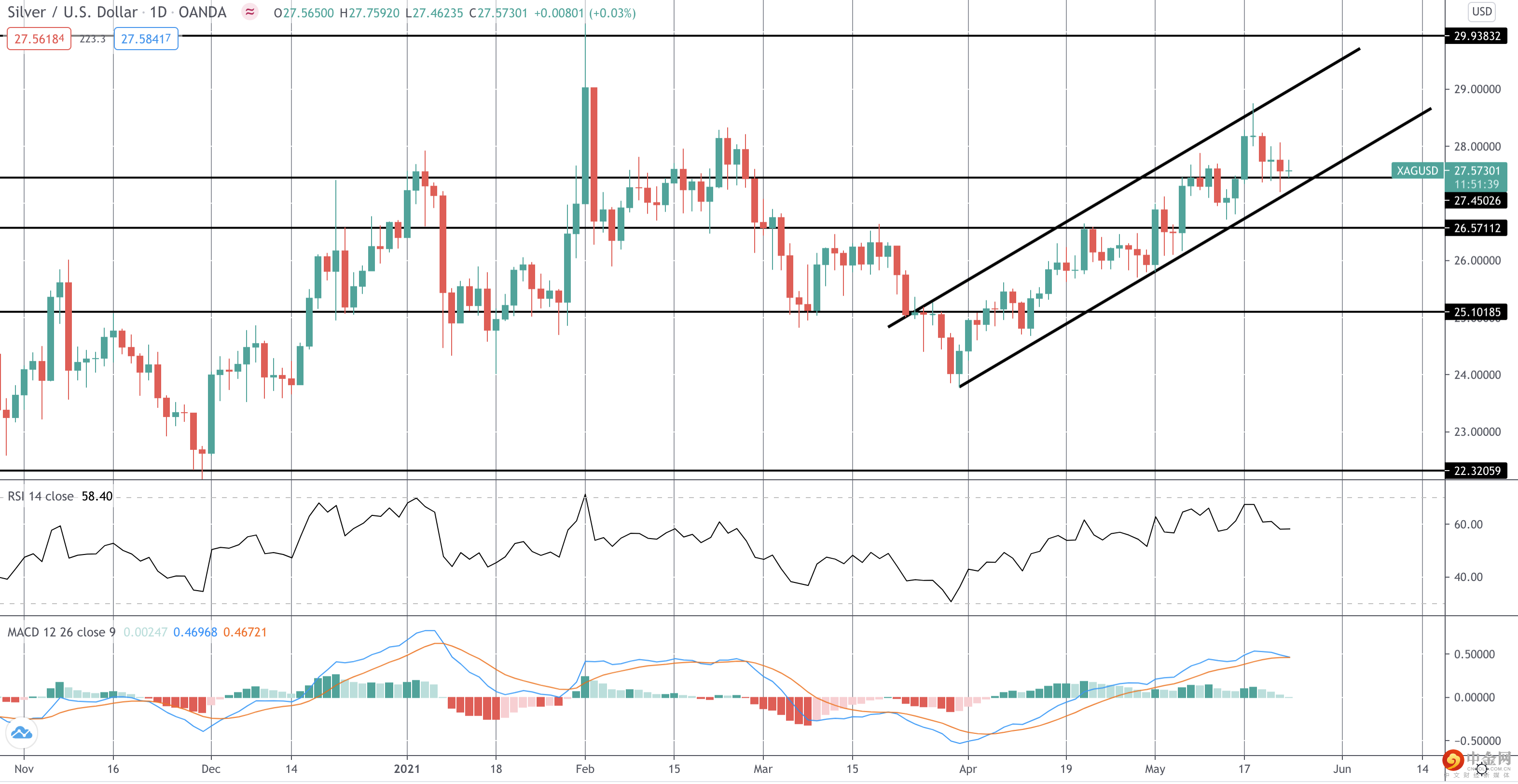 白银的多头通道目前保持不变,并且随着MACD看涨,焦点在进一步上行,而价格保持在27.4502上方。 然而,如果价格回落至此处下方,则焦点将转向下一个支撑位26.5711。