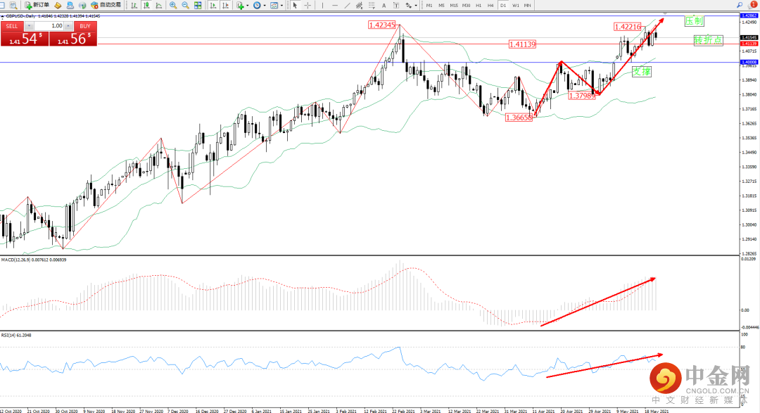 多头动力延续布林带指标通道中上轨区间持续震荡上扬,高位抵达1.42216位置后有继续攀升迹象,前期高位1.42345位置近在咫尺破位在即,布林带指标呈张口走势持续中,且不断向上拉升,上方压制关注1.42862附近,低位支撑关注1.40008附近,关注中上轨区间1.41139附近转折点,MACD指标处于多头区域维持震荡不断上扬中,RSI指标处于多头区域维持整理持续平移中,如图: