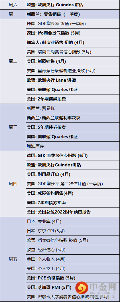 如上所述,美国截至目前的楼市数据一直差于预期。本周将以月末数据为5月画上句点,其中包括美国4月新屋销售和成屋签约销售。另外,请关注德国Ifo商业景气指数和GfK消费者信心指数(6月),观察该国4月信心是否回暖。另外,新西兰本周将公布一季度零售销售,并且新西兰联储将召开利率决策会议(不要忘了,新西兰政府非常关切楼市投机的活跃)。本周较为重要的经济数据如下: