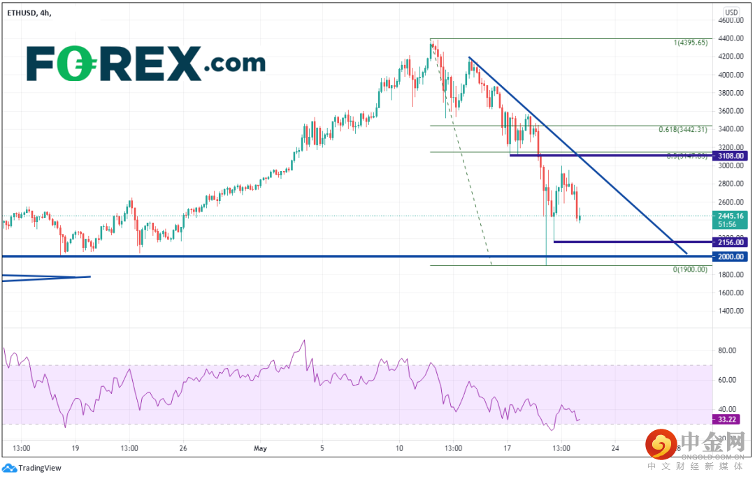 一般情况下我们不会连续两周关注数字加密货币,但考虑到波动性(以及波动性何时作用于全体市场的问题),这么做又似乎是合适的。本周我们不看比特币,而是看以太坊。我们先回顾它过往是如何剧烈震荡的。4月23日,以太坊触及2000,截至5月12日创下4358.16高点,涨逾115%。一周后的5月19日,价格回吐所有涨幅且在1900创下低点,之后回到2500下方不远处,也是目前的水平。是的,因为涨跌速度过快,我们都无法画出趋势线。不过,第一个阻力在水平趋势线与下降趋势线相汇的3108附近,然后是略高点的3147,那是50%回档位,接着是61.8%回档位3442。支撑位在5月20日下影线低点2145,然后是心理整数关口2000,接着是近期行情的下影线低点1900。