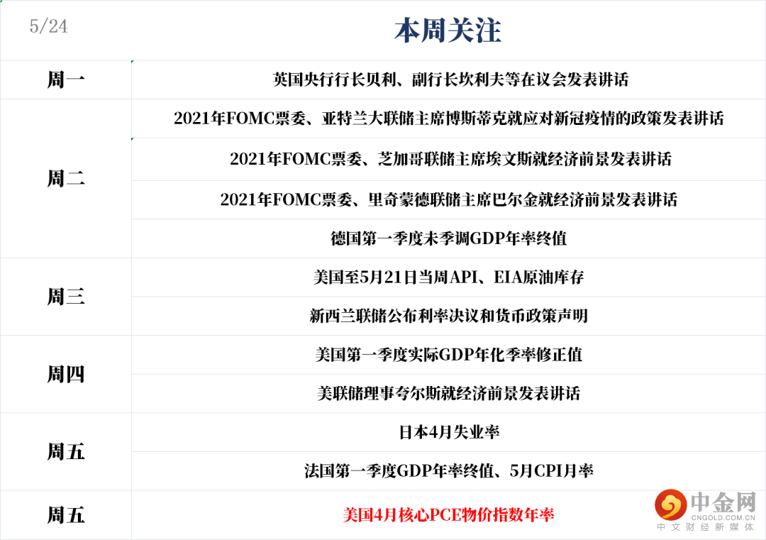 上周五,现货黄金先涨后跌,日内一度上爬至1889附近,周内再度止步于1890美元关口,但美盘开盘后持续下挫并一度失守1870美元关口,截至收盘,现货黄金收涨0.2%,报1880.37美元/盎司;现货白银收跌0.64%,报27.53美元/盎司。据CFTC报告,截至5月18日当周,COMEX黄金期货投机性净多头头寸增加11312手,总净多头头寸数量升至16周以来的最高水平。