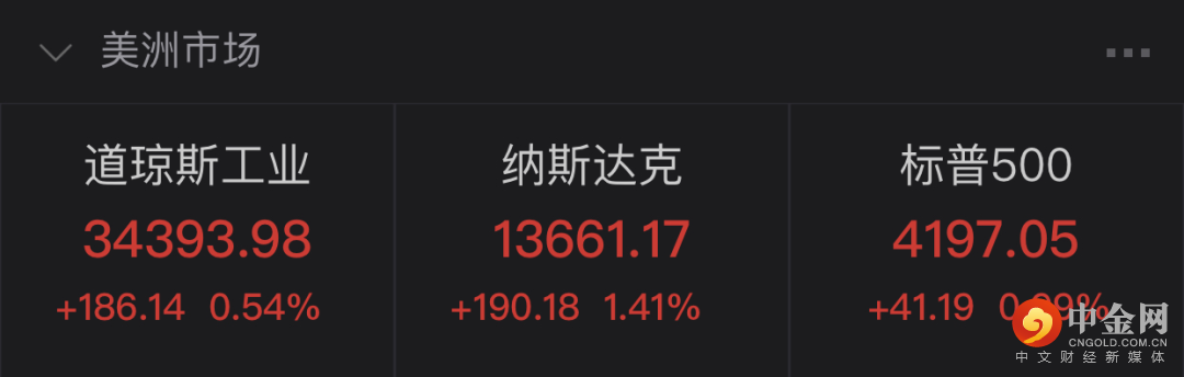 当地时间5月24日,美股三大指数集体收涨。截至收盘,道指涨0.54%报34393.98点,标普500指数涨0.99%报4197.05点,纳指涨1.41%报13661.17点。