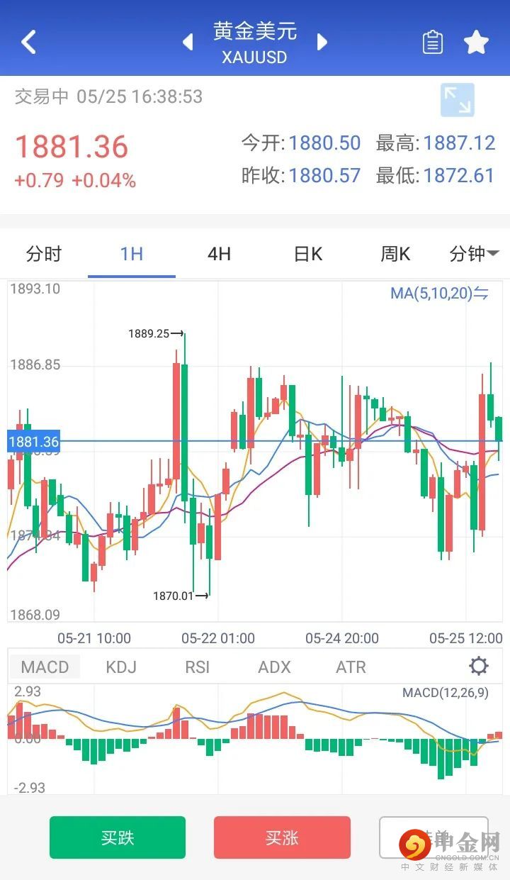 周一,现货黄金维持窄幅震荡的走势,欧盘初一度触及1875美元的日低,美盘交投区间收窄,最终收报1880.57美元/盎司,几近收于平盘。黄金在维持数日的强势之后,本交易日亚盘小幅回调。亚市尾盘,美元指数短线突然急跌,现货黄金大幅上涨,突破1885美元/盎司,较日内低点反弹近15美元。