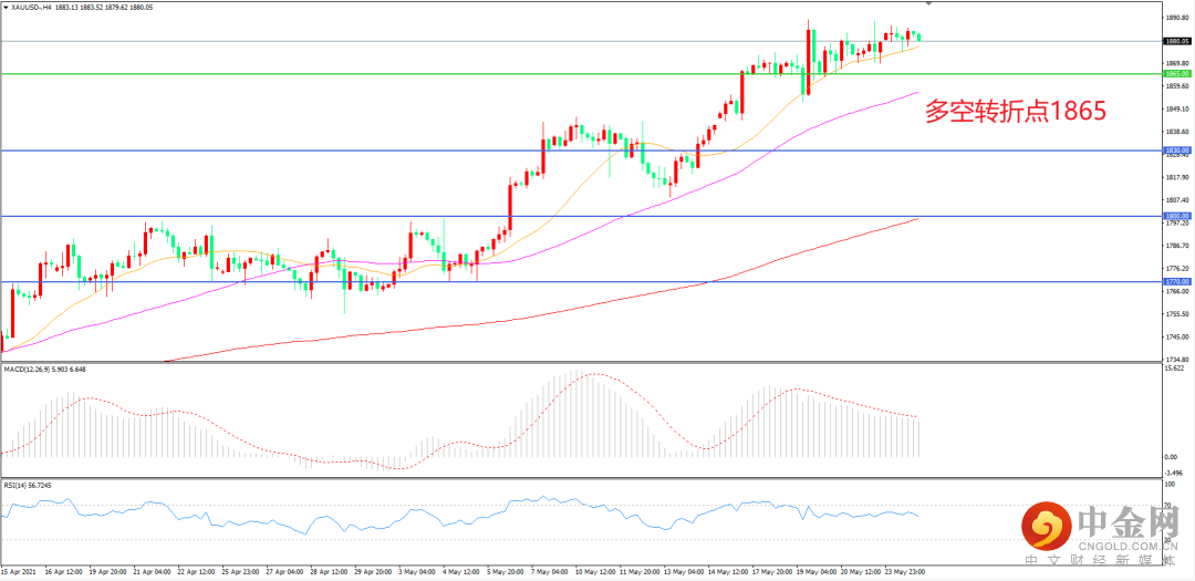现货黄金仍徘徊在逾四个月来高点附近,离1900美元总差一口气。短线来看,金价上涨乏力,可能陷入高位震荡,1900关口对多头来说是一个巨大的挑战。黄金若想突破该关口,需要更多的基本面利多因素发酵。