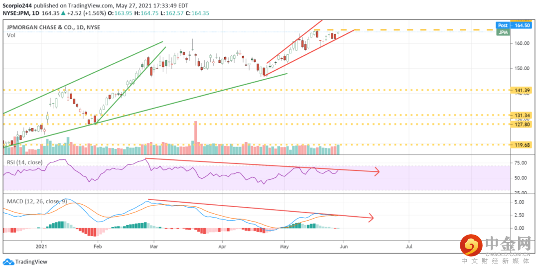 看起来摩根大通的图表有一个扩大的楔形形成。也许摩根大通的股价需要回落至156美元。