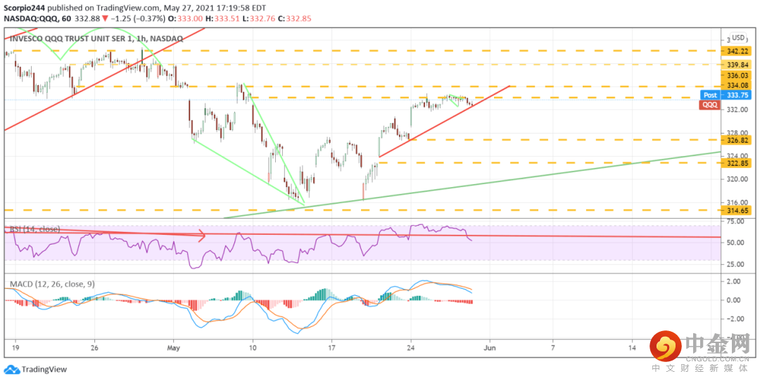 纳斯达克100指数基金再次在334美元水平线处遇阻,目前正位于上升趋势线处。若纳斯达克100指数基金跌破该趋势线,则会快速跌回327美元。