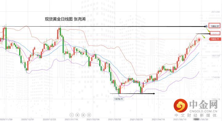 周五;金价白盘继续承压走低,并在美盘前如期触及给出的10日均线支撑1882美元附近目标位,不过,美国开盘后,4月份核心个人消费价格指数(PCE)的增幅为3.1%,创1992年7月以来新高,令市场通胀预期急速攀升,且提振黄金作为通胀对冲工具的吸引力后,金价逆转走势,再加上白宫公布了一项6万亿美元的预算提案影响,黄金一举升穿1900美元关口,最高触及1904.76美元,终收于1903.60美元,周振幅39.81美元,收涨22.07美元,涨幅1.17%。