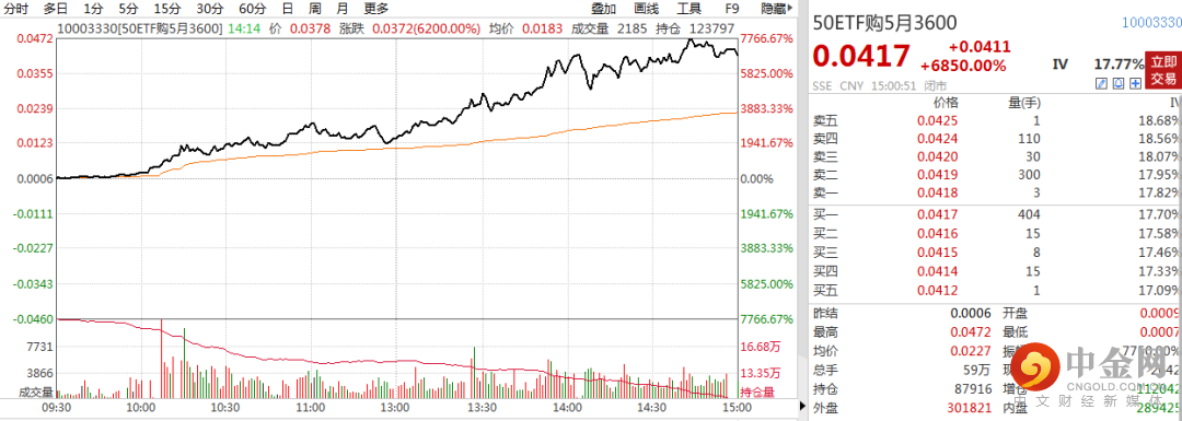 一个合约的涨幅反映的是前后交易日结算价的变化,并不等于实际收益。不同的投资者买卖时点不同,损益情况会差别很大。以50ETF购5月3600为例,如果追涨进场,投资者的收益不一定会很理想。今日该合约成交均价是0.0227,收盘价0.0417,若以均价买入,当日收益为84%,这就意味着,今天入场的投资者实际平均只获得了84%的收益,远低于所谓的68倍收益。