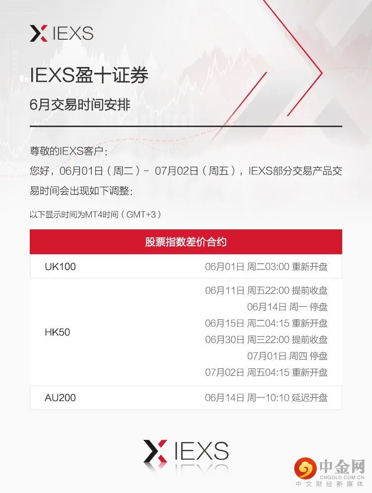 您好,2021年6月3日(周二)-2021年7月2日(周五),IEXS部分交易产品交易时间将出现相应调整如下: