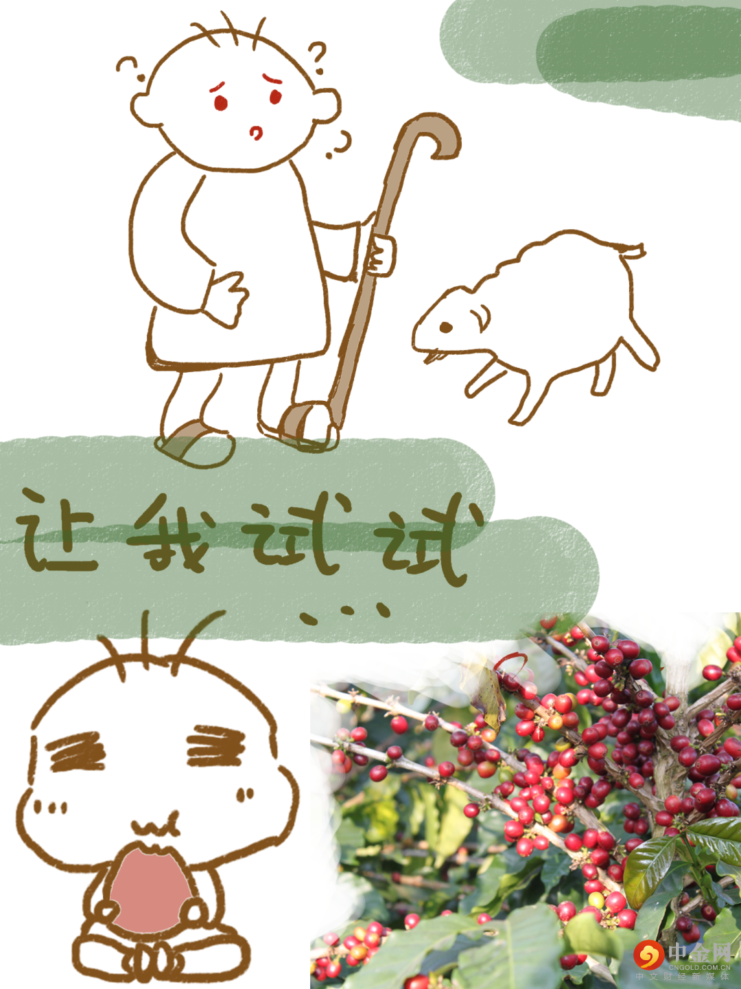 故事是这样的,有一天,一个年轻的牧羊人卡尔迪正在放羊。他发现他的山羊经常出没在一些常绿灌木中,而灌木上有很多小小的红色果实。