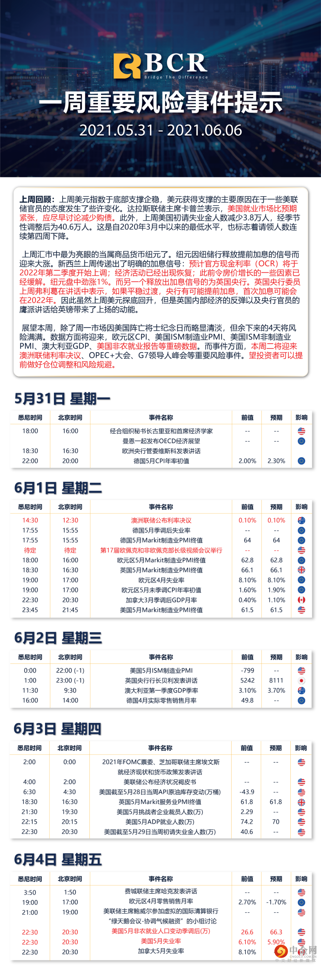 【BCR】一周重要风险时间提示 2021.05.31 - 2021.06.06