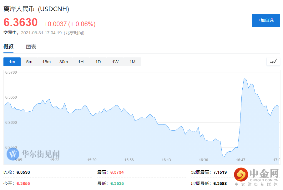 离岸人民币兑美元短线下挫160点,现报6.3630。