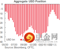 传统外汇避风港本周整体仓位变化不大;尽管日元在报告周内几乎没有变化,但日元净空头仍然存在。日元净空头反映了这个市场中唯一一个情绪比美元更负面的领域。本周瑞士法郎净头寸出现一些空头回补,但 4 月中旬出现的温和看跌偏见仍然存在。