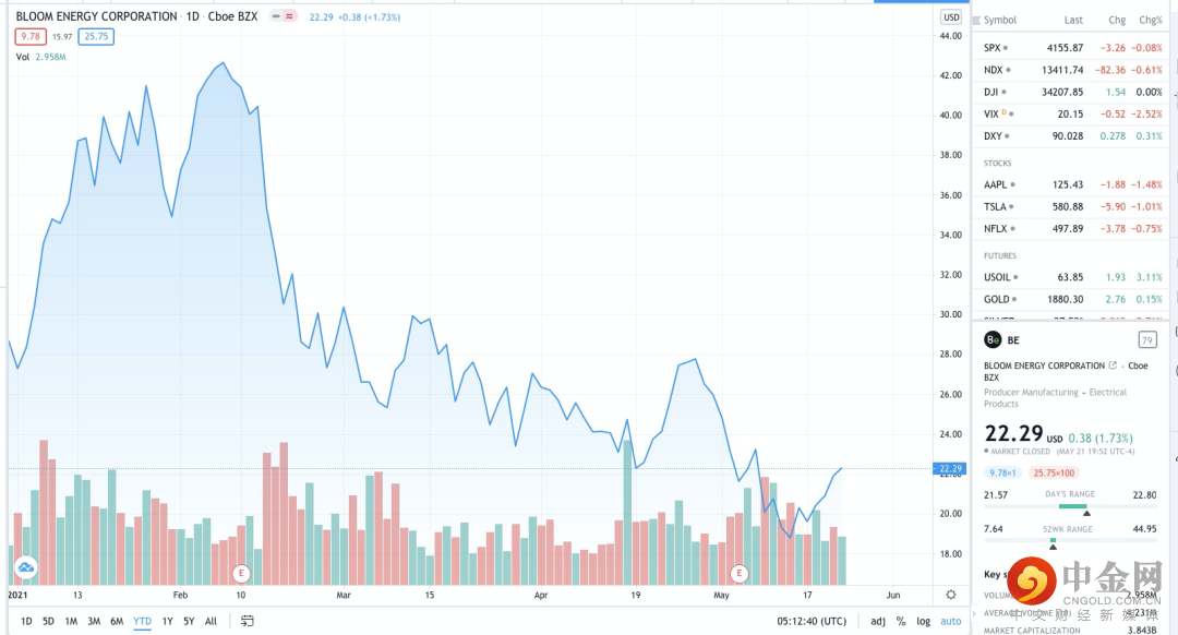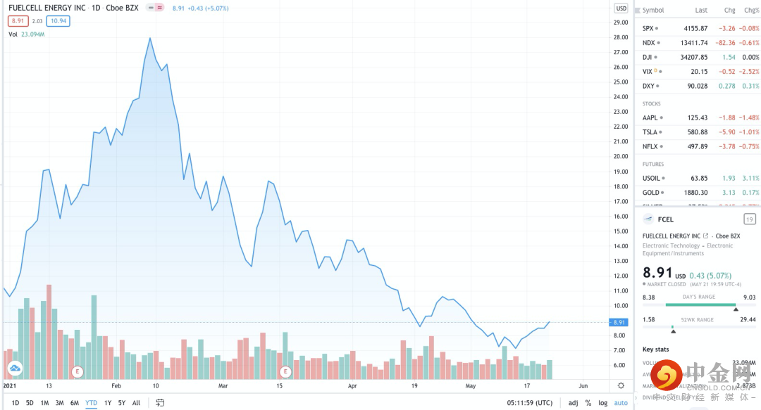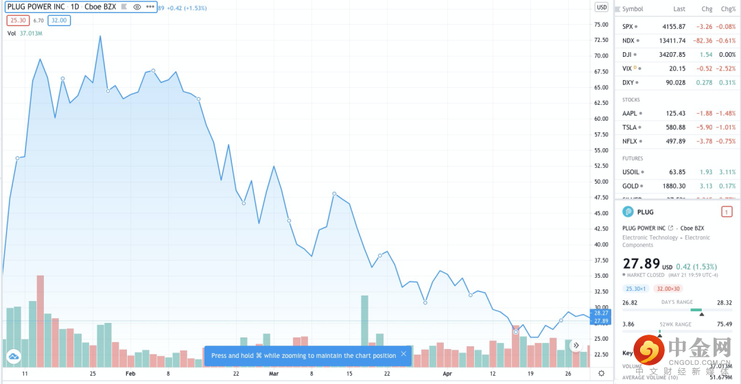 就全球个股交易机会来看,美国“氢能三剑客”不得不知——普拉格能源Plug Power((PLUG.US))、Bloom Energy(PLUG.US)和燃料电池能源Fuelcell Energy(FCEL.US),这“三剑客”的股价在去年拜登赢得大选和新冠疫苗的消息推动下一度大幅飙升,但也都在今年1月底美债收益率飙升的背景下遭遇“杀估值”,例如,根据Tradingview数据,普拉格能源从2021年1月26日的74.03美元回调至5月22日的27.89美元,回调幅度高达62%。目前介入机会是否重现备受投资者关注。