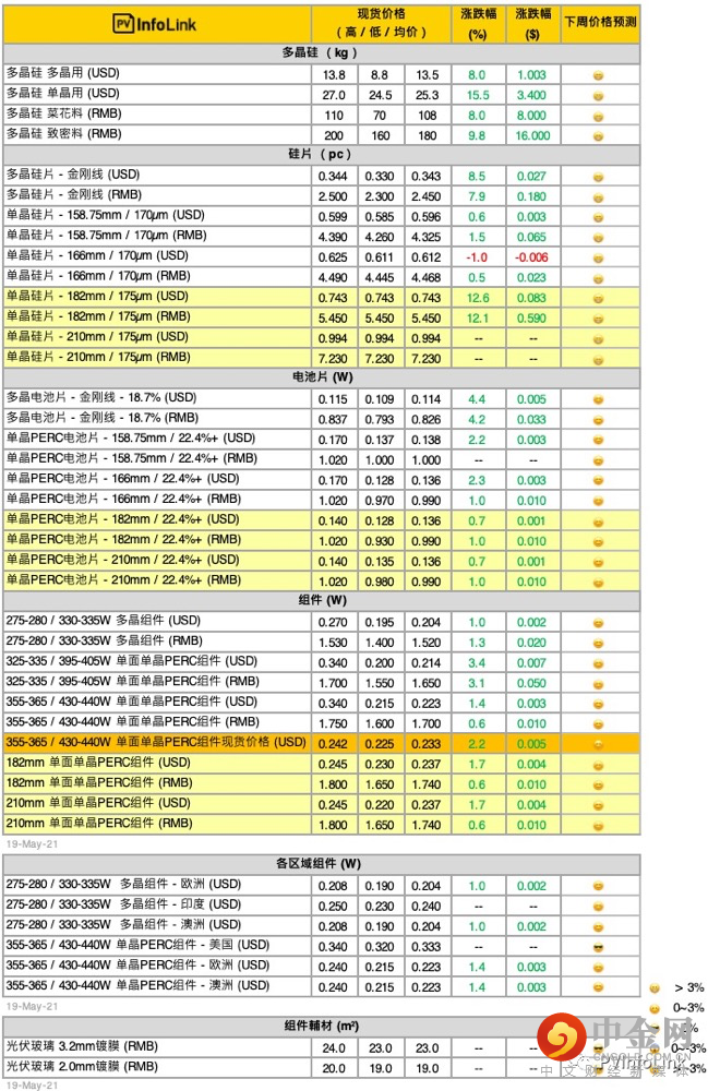 例如,硅料的的持续涨价使得上游行情备受关注。5月19日,PVInfoLink发布最新光伏供应链价格信息,多晶硅料(致密料)报价已达到200元/公斤。去年12月底,硅料价格还在80-82元/公斤。